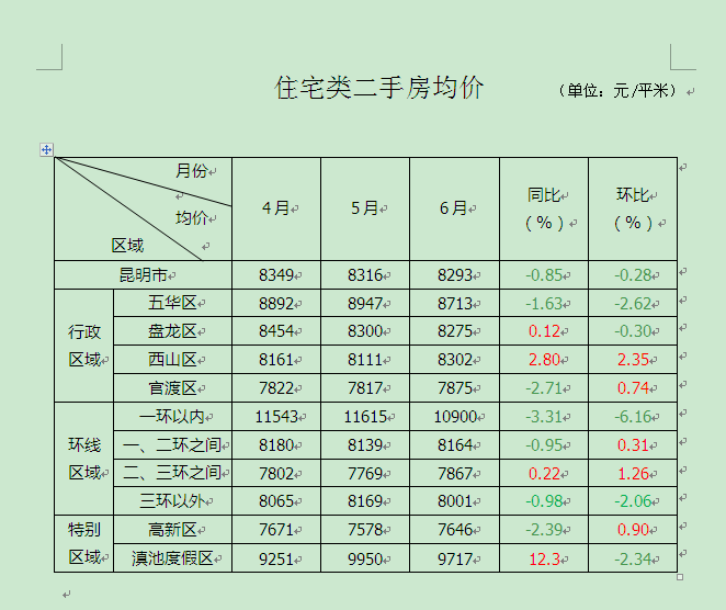 其中同比跌幅最大的区域是一环以内(-3.31%),涨幅最大的区域是滇池度假区(+12.3%);环比跌幅最大的区域是一环以内(-6.16%),涨幅最大的区域是西山区(+2.35%)。